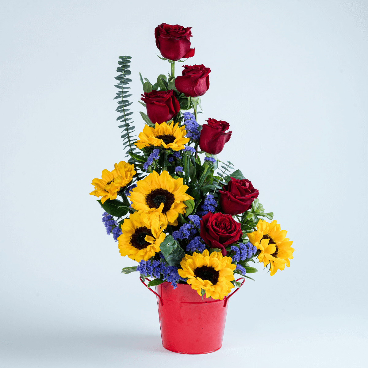 Arreglo de 36 flores (rosas y girasoles) en base de porcelana